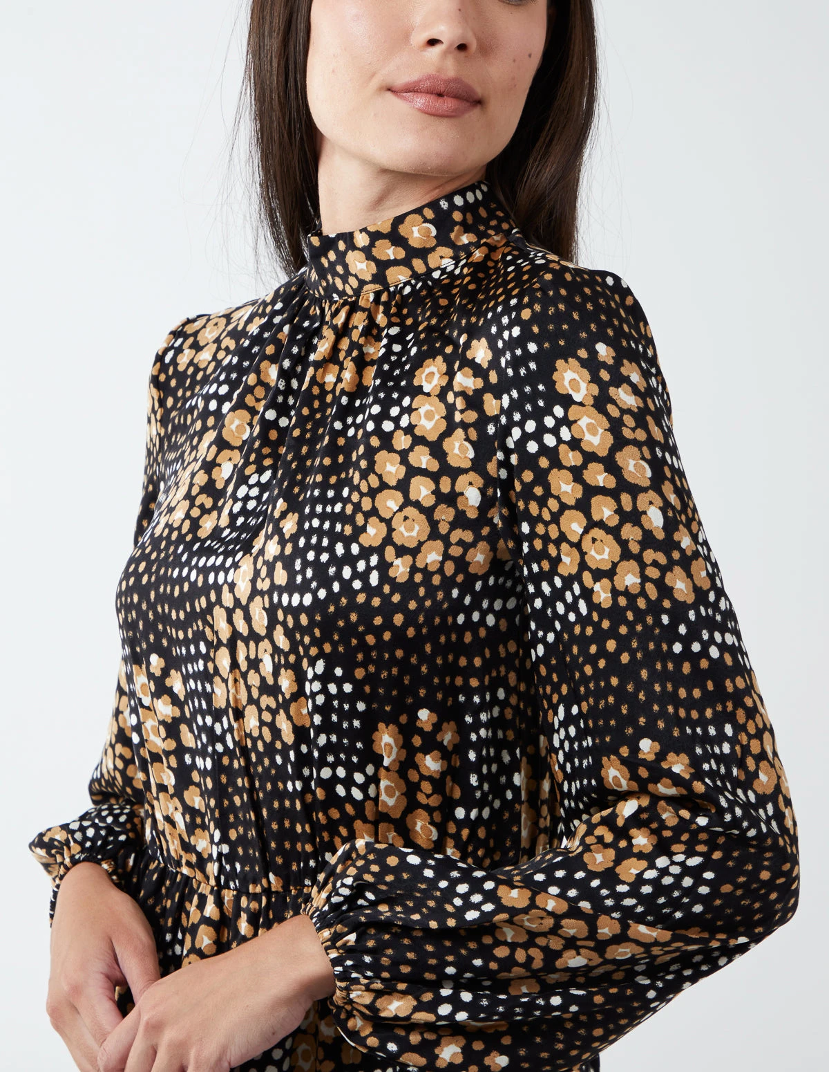 The Blouson Elasticated Wrap Midi Dress features a floral and polka dot print, a wrap bottom, and a high neck. Look ultra stylish for your next date night! Simply match with ankle black boots and a mini bag.