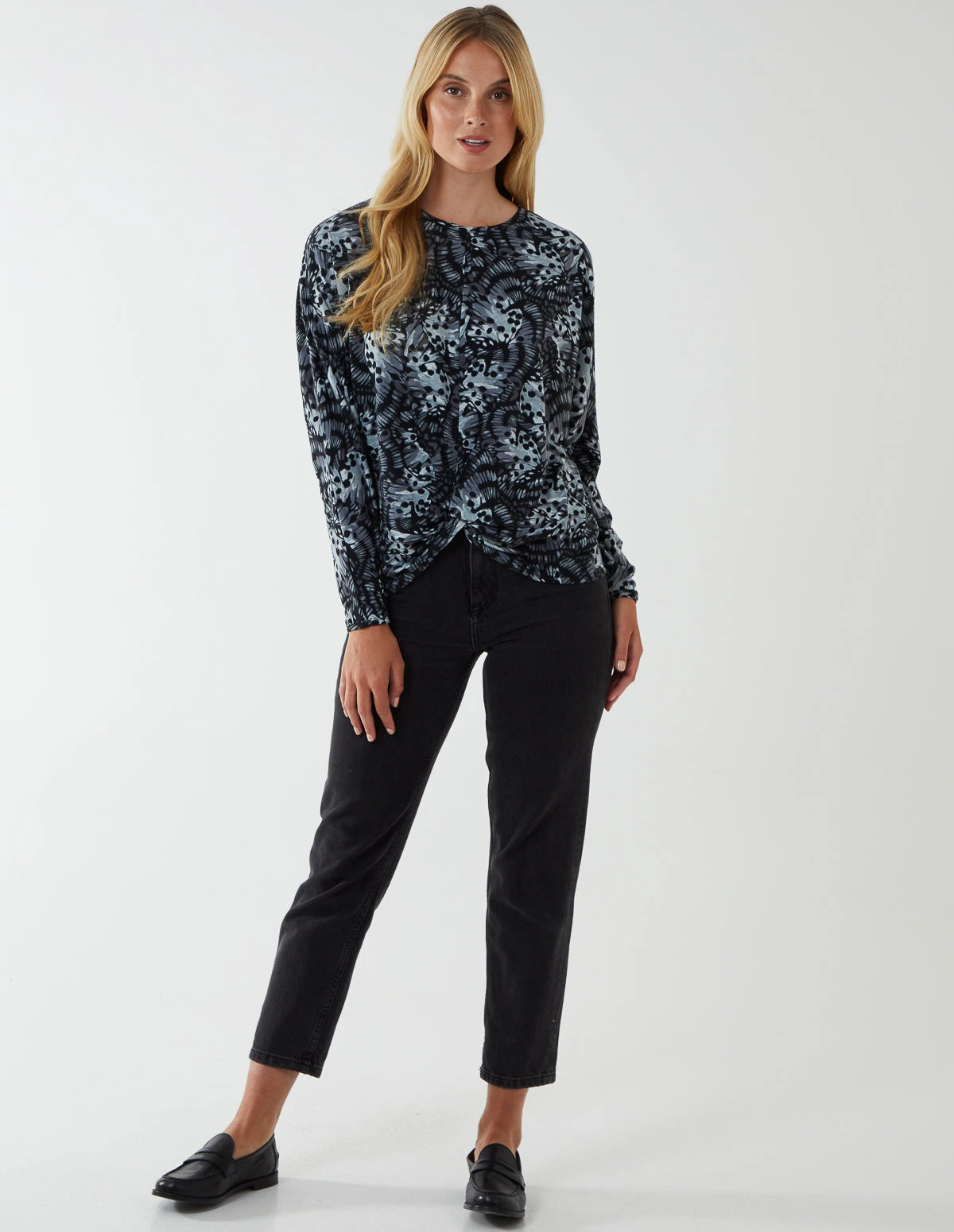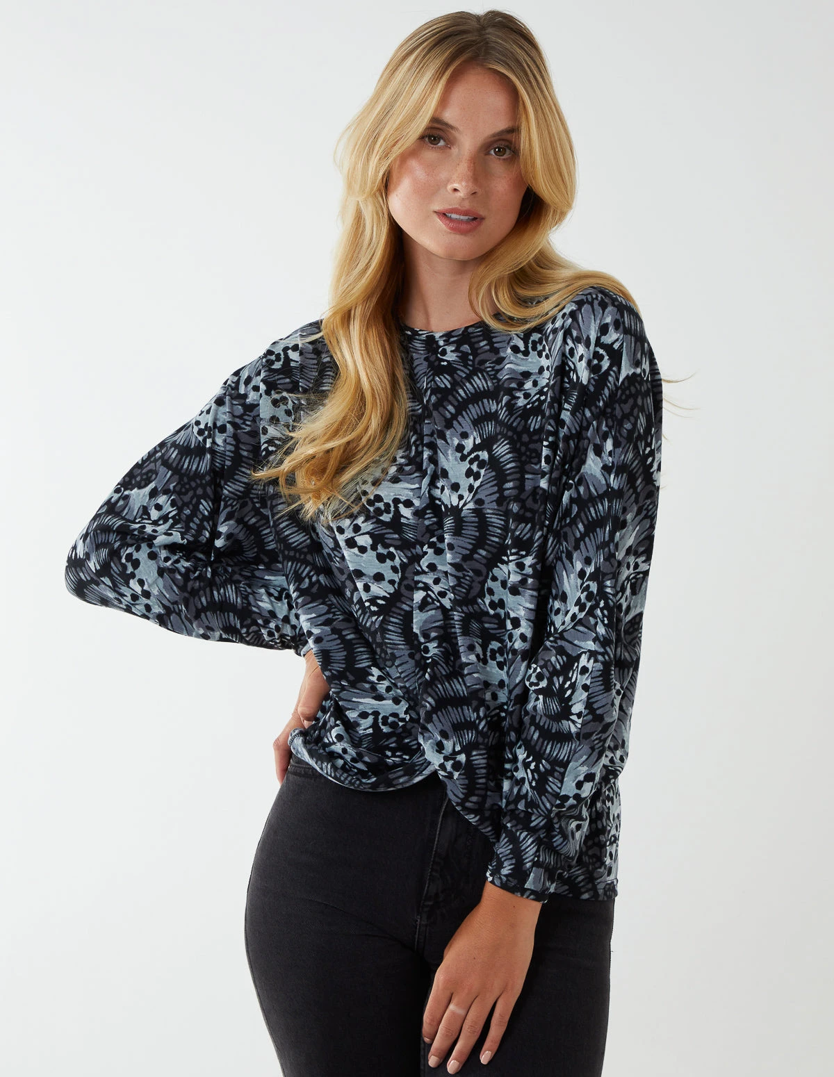 Comfy and chic. That’s our Butterfly Print Knot At Hip Cut & Sew Top. Go on casual drinks with your friends by matching this batwing long sleeve top with high waisted blue jeans and heeled boots.Â
