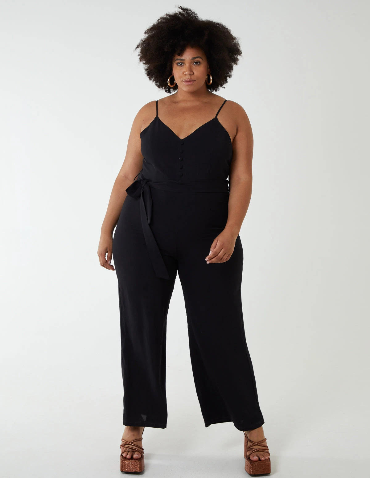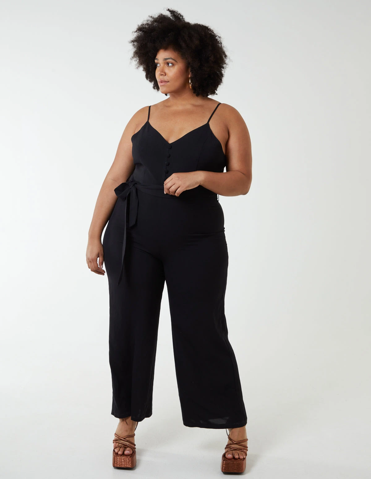 Our elegant jumpsuit is finished with a tie front waist, flattering shaped neckline and a decorative button front. An effortless choice for summer evenings out.