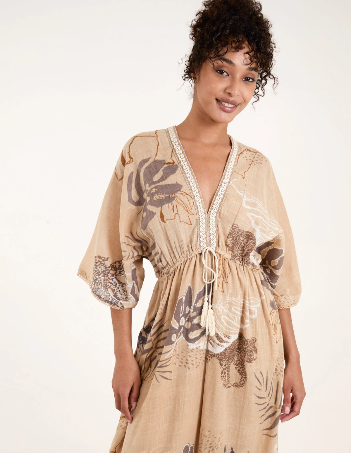 V Neck Tassel Front Midi Dress